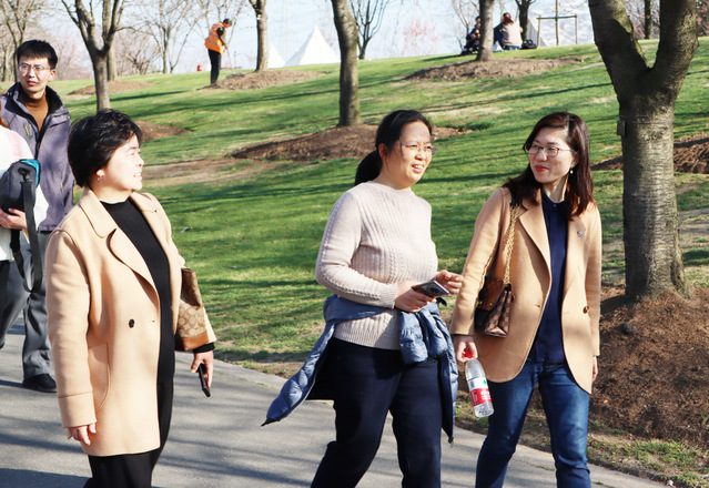 大家從公園1號門入園,滿園春色撲面而來。樹木蔥郁,鮮花盛開;湖光瀲滟,景色壯美。廣場旁櫻花道的河津櫻已經綻放,老師們興致盎然地觀賞百花斗艷,合影留念。