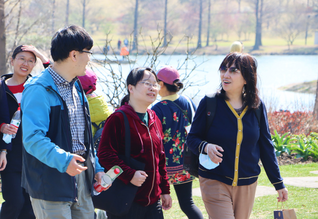 在前往礦坑花園的路上,步移景異,岸邊柳條隨風飄舞,幾只天鵝徜徉水面,悠閑自在。梅花、玉蘭、鳶尾、海棠等各種花卉,共同編織著五彩斑斕的美好春天,令人神清氣爽,心情愉悅。大家邊走邊聊,一掃平時繁忙的工作帶來的疲憊,歡聲笑語此起彼伏,處處洋溢著教師們的活力與熱情。圖片