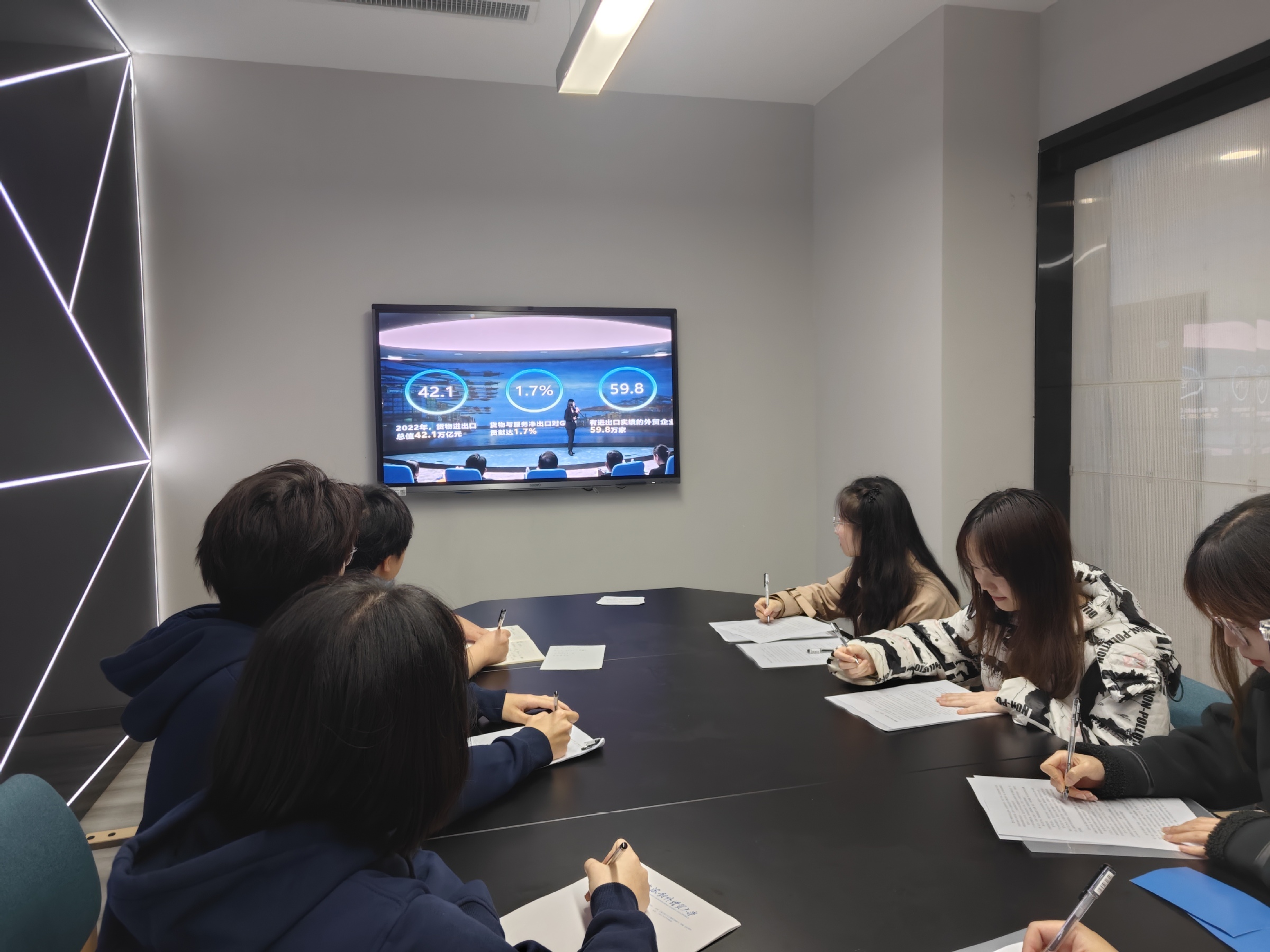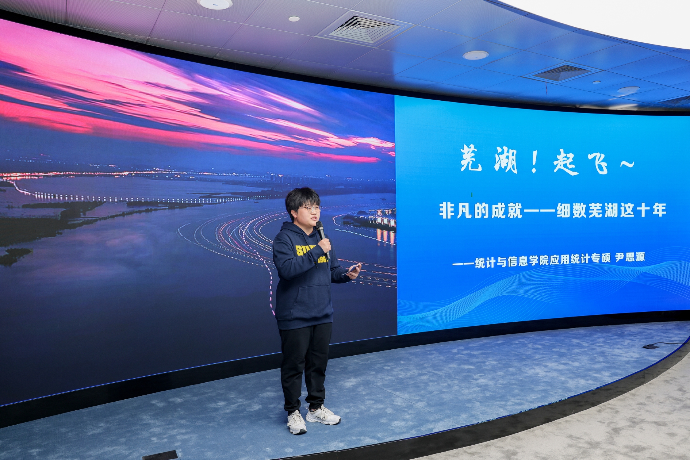 “十年來(lái),我國(guó)貨物貿(mào)易規(guī)模不斷躍升,年均增長(zhǎng)8.6%,已突破40萬(wàn)億人民幣關(guān)口,連續(xù)6年保持世界貨物貿(mào)易第一大國(guó)地位?!?“全社會(huì)研發(fā)經(jīng)費(fèi)投入強(qiáng)度從2.1%提高到2.5%以上,科技進(jìn)步貢獻(xiàn)率提高到60%以上……”一句句鏗鏘有力的講解在實(shí)驗(yàn)室立體環(huán)繞,一串串激動(dòng)人心的數(shù)據(jù)躍上實(shí)驗(yàn)室的弧形大屏,這是上海對(duì)外經(jīng)貿(mào)大學(xué)統(tǒng)計(jì)與信息學(xué)院的師生在科技感滿滿的實(shí)驗(yàn)室里開(kāi)設(shè)的一堂“數(shù)說(shuō)新時(shí)代十年發(fā)展成就”思政課。