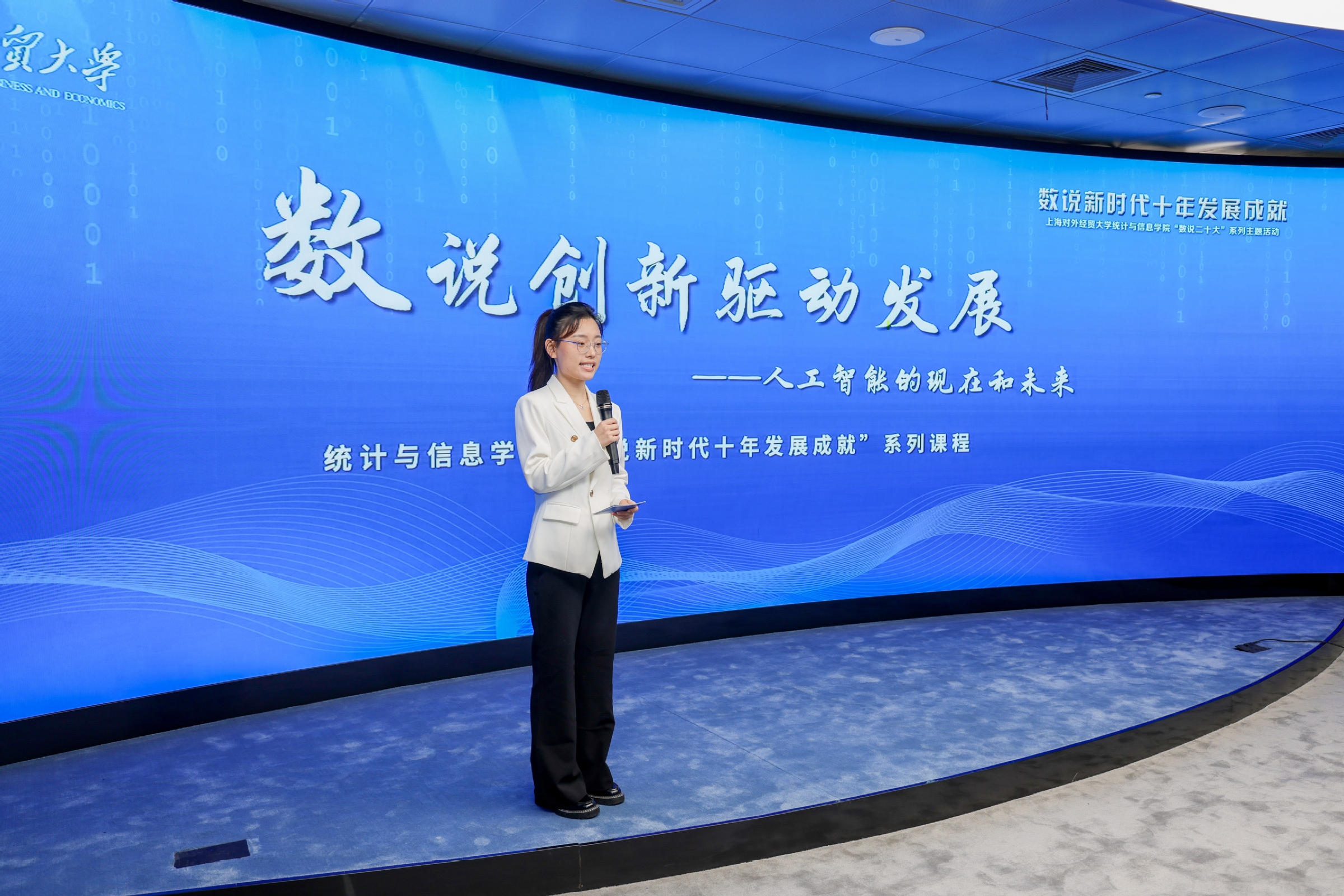 圍繞“數(shù)說(shuō)新時(shí)代十年發(fā)展成就”,師生們進(jìn)行了三場(chǎng)微課展示。第一場(chǎng)以《數(shù)說(shuō)家鄉(xiāng)這十年》為主題,由獲獎(jiǎng)學(xué)生代表共同講述,他們通過(guò)調(diào)研走訪和數(shù)據(jù)挖掘向大家展示了家鄉(xiāng)云南沙溪、安徽蕪湖和上海十年間發(fā)生的巨大變化。第二場(chǎng)以《數(shù)說(shuō)貿(mào)易強(qiáng)國(guó)——建設(shè)大市場(chǎng),共享大機(jī)遇》為主題,經(jīng)濟(jì)統(tǒng)計(jì)系李佩瑾老師和李昕禹同學(xué)共同授課,他們通過(guò)一系列的數(shù)字增長(zhǎng),令人信服地展示了十年來(lái)我國(guó)對(duì)外貿(mào)易取得的成績(jī)以及進(jìn)博會(huì)五年的成績(jī)單,表達(dá)了對(duì)貿(mào)易強(qiáng)國(guó)建設(shè)的信心和建設(shè)貿(mào)易強(qiáng)國(guó)的使命。第三場(chǎng),計(jì)算機(jī)與人工智能系劉慧老師和封冰悅同學(xué)以《數(shù)說(shuō)創(chuàng)新驅(qū)動(dòng)發(fā)展》為主題,通過(guò)大量的數(shù)據(jù)、圖表和對(duì)比分析,呈現(xiàn)了十年間我國(guó)在科技創(chuàng)新方面取得的矚目成果,尤其是人工智能等新技術(shù)的未來(lái)發(fā)展趨勢(shì)。這些精彩紛呈的課程激勵(lì)青年胸懷遠(yuǎn)大理想,用實(shí)踐擦亮青春底色,用奮斗助力國(guó)富民強(qiáng),為中國(guó)式現(xiàn)代化貢獻(xiàn)青春力量。