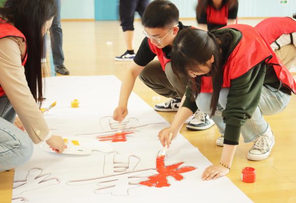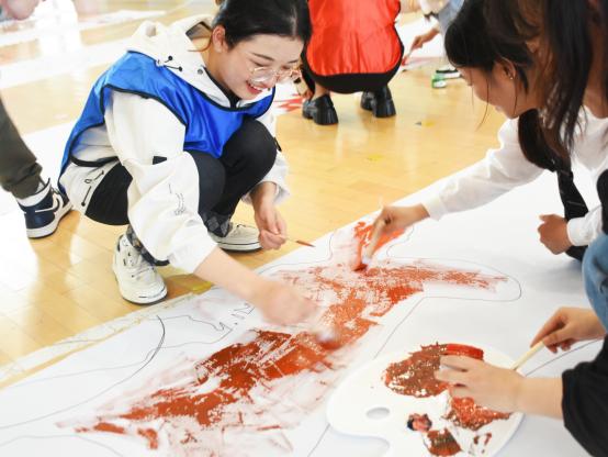 在微團建環節,肖包興邦老師帶領大家開展了“同舟共濟過草地”、“粗中有細定乾坤”等團建游戲。最后,在場的所有師生們共同拿起畫筆,勾勒線條、揮筆潑墨,描繪斑斕青春,暢想未來之夢,共同繪制出“傳承五四精神,共繪青春風采”的巨幅畫卷。