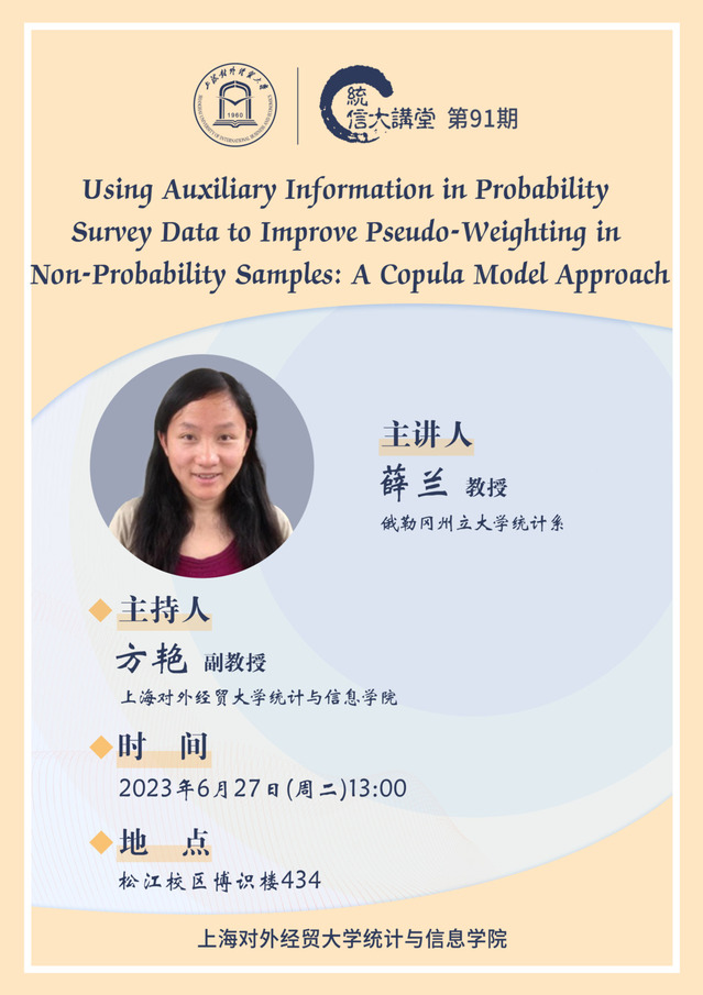 06.27 題目:Using Auxiliary Information in Probability Survey Data to Improve Pseudo-Weighting in Non-Probability Samples: A Copula Model Approach
