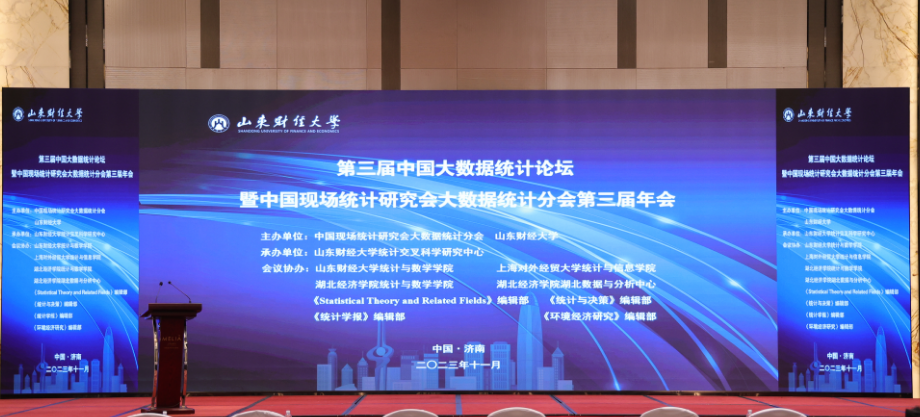 為進一步促進大數據統計學科發展,加強統計學、計算機、數學等數據科學相關領域的學術交流,2023年11月3日-5日,由中國現場統計研究會大數據統計分會和山東財經大學聯合主辦,上海對外經貿大學統計與信息學院等單位協辦的第三屆中國大數據統計論壇暨中國現場統計研究會大數據統計分會第三屆年會在山東濟南順利召開。本次會議采用線上線下相結合的形式,現場吸引了來自北京大學、清華大學、山東大學、中國科學院、中國人民大學、廈門大學等百余家高校及研究機構的近400位專家和學者參加了現場會議,9萬余人觀看了線上直播。大會組織了9場大會報告,49場分組報告,并舉辦首屆研究生論壇20余場學術報告。作為主要協辦方之一,上海對外經貿大學統計與信息學院深度參與會議的籌劃與組織工作,保障了會議的順利舉行。中國現場統計研究會大數據統計分會理事長、統計與信息學院院長張日權,副院長趙倩、王利娟、李睿,部分教師代表以及近30位碩士研究生參加了會議。開幕式由山東財經大學統計與數學學院院長安起光主持。
