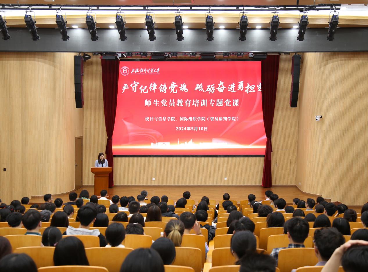 為扎實(shí)開展好黨紀(jì)學(xué)習(xí)教育,推動(dòng)黨員教育培訓(xùn)走深走實(shí),5月10日下午,上海對(duì)外經(jīng)貿(mào)大學(xué)統(tǒng)計(jì)與信息學(xué)院黨委與國際組織學(xué)院(貿(mào)易談判學(xué)院)黨委以“嚴(yán)守紀(jì)律鑄黨魂 砥礪奮進(jìn)勇?lián)?dāng)”為主題,聯(lián)合開展師生黨員教育培訓(xùn)暨黨紀(jì)學(xué)習(xí)教育專題黨課,近200名師生黨員同上一堂黨課。培訓(xùn)活動(dòng)邀請(qǐng)中共上海市委黨校(上海行政學(xué)院)張永杰老師授課,活動(dòng)由統(tǒng)計(jì)與信息學(xué)院、國際組織學(xué)院(貿(mào)易談判學(xué)院)黨委書記劉素貞主持。