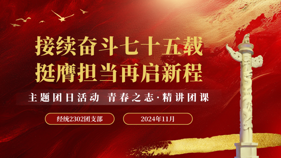 為深入學(xué)習(xí)貫徹習(xí)近平新時(shí)代中國特色社會(huì)主義思想,全面貫徹黨的二十大和二十屆三中全會(huì)精神,認(rèn)真做好面向廣大團(tuán)員和青年開展學(xué)習(xí)貫徹習(xí)近平新時(shí)代中國特色社會(huì)主義思想主題教育,著力加強(qiáng)對(duì)共青團(tuán)員政治鍛造,加強(qiáng)對(duì)廣大青年政治引領(lǐng),充分激發(fā)新時(shí)代中國青年在強(qiáng)國建設(shè)、民族復(fù)興偉業(yè)中挺膺擔(dān)當(dāng),奮力書寫為中國式現(xiàn)代化挺膺擔(dān)當(dāng)?shù)那啻浩隆=?jīng)統(tǒng)2302團(tuán)支部于2024—2025學(xué)年第一學(xué)期開展“接續(xù)奮斗七十五載挺膺擔(dān)當(dāng)再啟新程”主題團(tuán)日活動(dòng)。