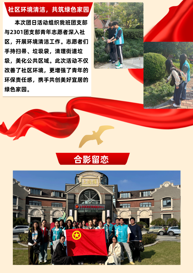 活動(dòng)內(nèi)容:經(jīng)統(tǒng)2302團(tuán)支部、經(jīng)統(tǒng)2301團(tuán)支部的同學(xué)在社區(qū)工作人員的帶領(lǐng)下進(jìn)行社區(qū)清潔,隨后前往社區(qū)黨群服務(wù)中心,由經(jīng)統(tǒng)2302團(tuán)支部楊梓垚同學(xué)講述其參演上海對(duì)外經(jīng)貿(mào)大學(xué)原創(chuàng)大師劇《裘劭恒》的經(jīng)歷和見聞。
