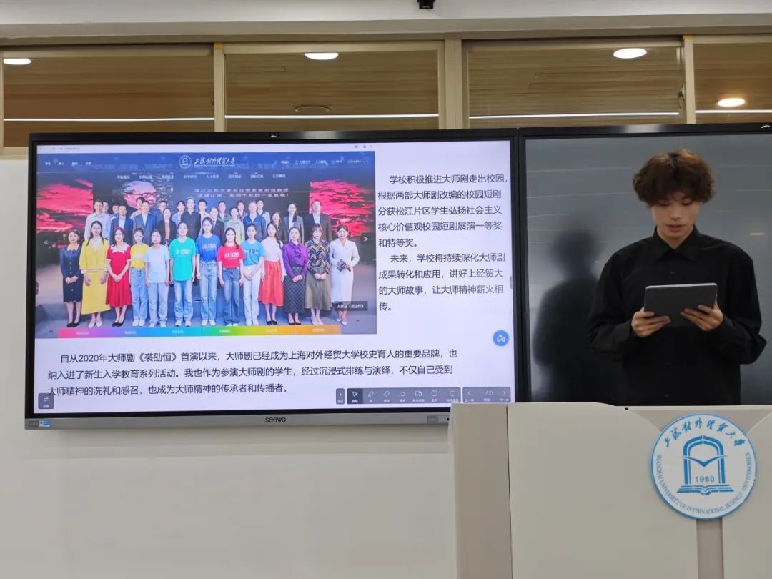 以“先鋒領(lǐng)航新途共拓”為第二章,“校園文藝先鋒”張顥嚴(yán)同學(xué)分享了其參演上海對(duì)外經(jīng)貿(mào)大學(xué)原創(chuàng)大師劇《裘劭恒》的經(jīng)歷和心得體會(huì),“校園實(shí)踐先鋒標(biāo)兵”代翊群同學(xué)和大家分享了組織負(fù)責(zé)上海高校菁英匯的工作總結(jié)。二人的素質(zhì)拓展分享為同學(xué)們提供了新青年全面發(fā)展的新思路。