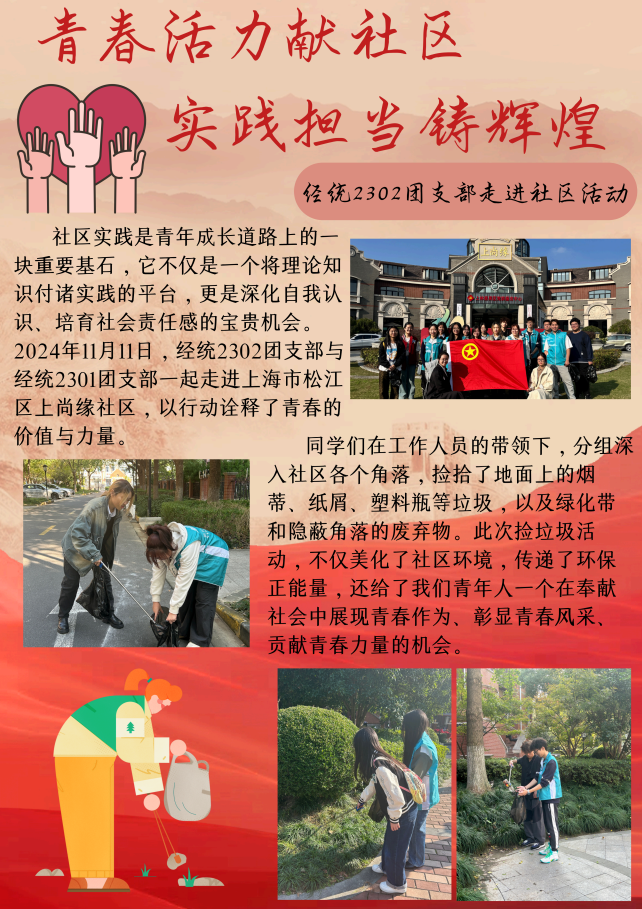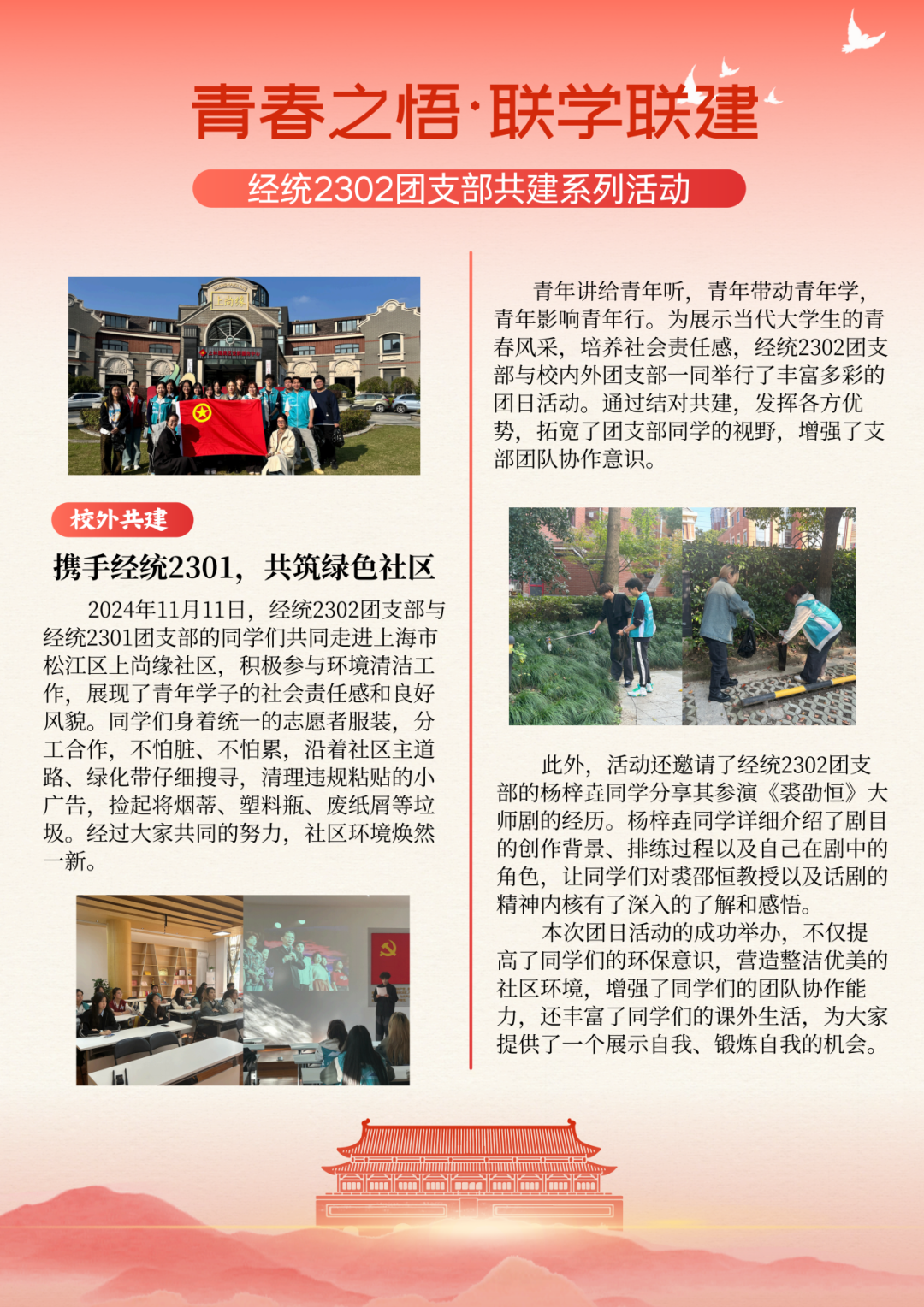 共建單位:經(jīng)統(tǒng)2302團(tuán)支部、經(jīng)統(tǒng)2301團(tuán)支部、松江區(qū)上尚緣社區(qū)支部。