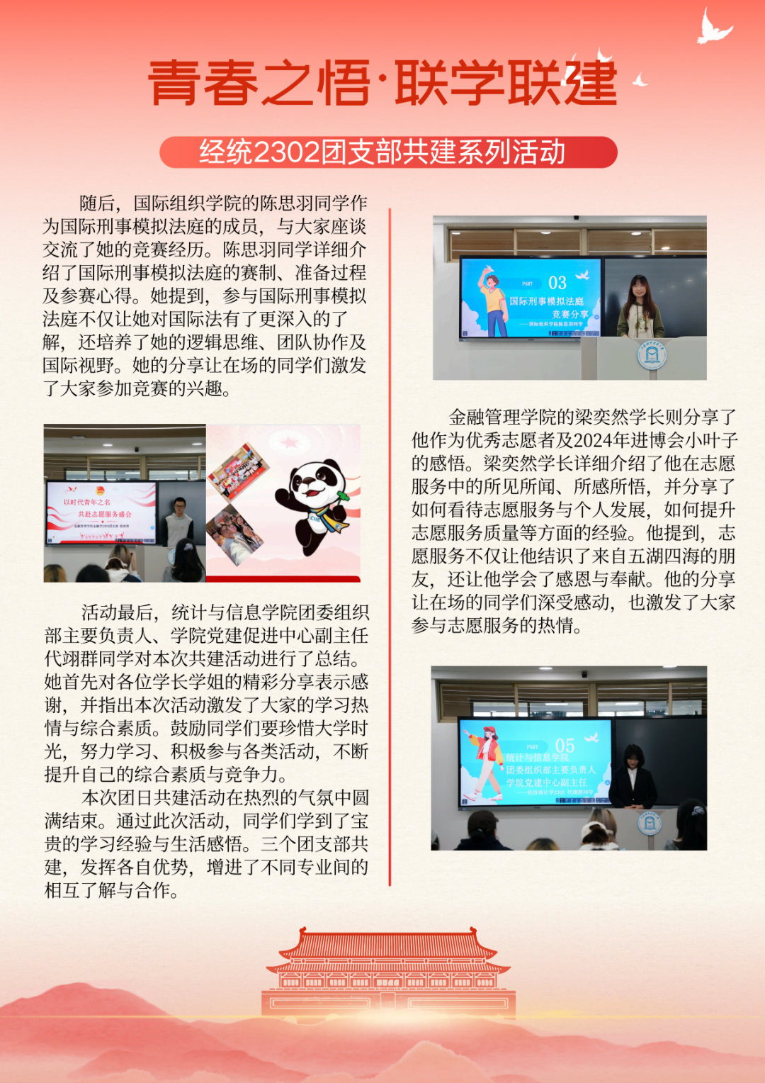 為促進(jìn)支部間互通互學(xué),現(xiàn)作校級(jí)一等獎(jiǎng)獲得支部——經(jīng)統(tǒng)2302團(tuán)支部的活動(dòng)展示。