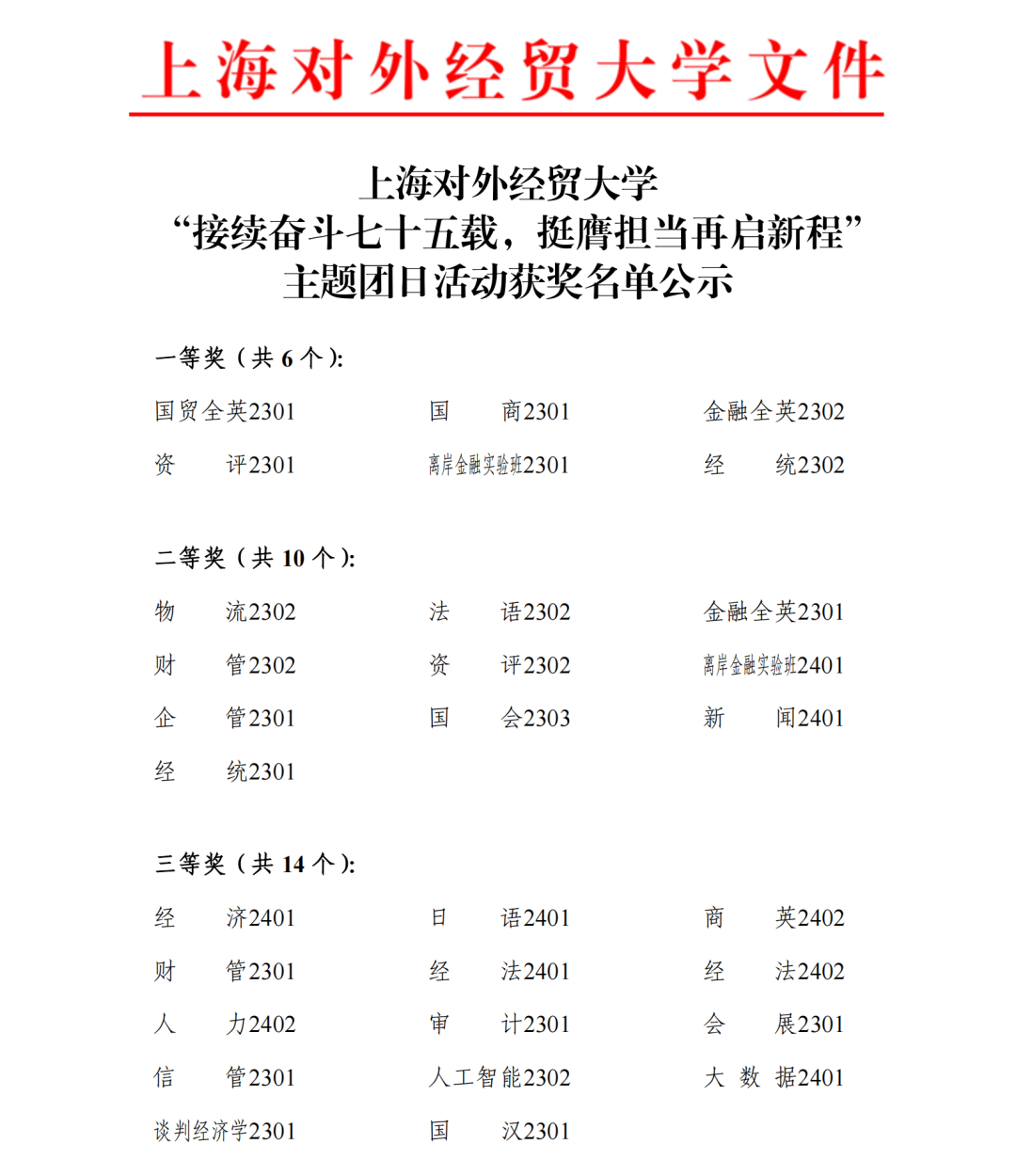 經(jīng)院級(jí)推薦和校級(jí)評(píng)選,經(jīng)統(tǒng)2302團(tuán)支部獲校級(jí)一等獎(jiǎng),經(jīng)統(tǒng)2301團(tuán)支部獲校級(jí)二等獎(jiǎng),人工智能2302團(tuán)支部、信管2301團(tuán)支部和大數(shù)據(jù)2401團(tuán)支部獲校級(jí)三等獎(jiǎng)。