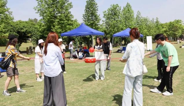 G區“乾坤圈換位解”游戲環節中,活動中,成員們需持繩圍成一圈,并在換位后迅速解開錯綜的繩索,在不斷的嘗試中逐漸發現規律,展現出優秀的空間思維和解決問題的能力。H區“龍宮品鑒會”游戲環節需要團隊成員通過細致的味覺分辨,辨別糖果的細微差別,完成糖果酸度的排序,在互動中提升了感知能力和判斷力。I區“乾坤圈速通”游戲環節要求全體成員保持高度協調,成員們需要手拉手快速傳遞呼啦圈。隨著呼啦圈在隊員間快速傳遞,整齊劃一的動作展現出團隊的高度協調性。