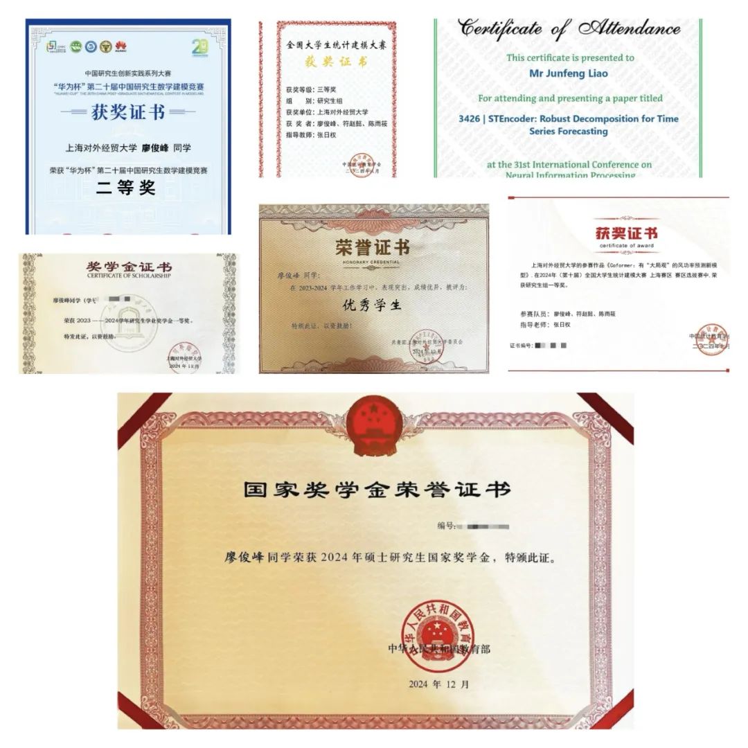廖俊峰,就讀于上海對外經貿大學統計與信息學院應用統計研究生專業。研究生期間,榮獲2023-2024學年研究生國家獎學金,連續兩年(2023-2024、2024-2025學年)獲得研究生學業獎學金一等獎,并獲評2023-2024學年校級'優秀學生'榮譽稱號。競賽方面,獲中國研究生數學建模競賽國家二等獎、全國大學生統計建模大賽國家三等獎等獎項。學術研究上,參與國家自然科學基金面上項目等多項課題,研究成果發表于ICCASSIT2024和ICONIP2024國際會議,另有兩篇預印本論文發布于arXiv。現已獲得悉尼科技大學計算機科學專業全額獎學金博士錄取。
