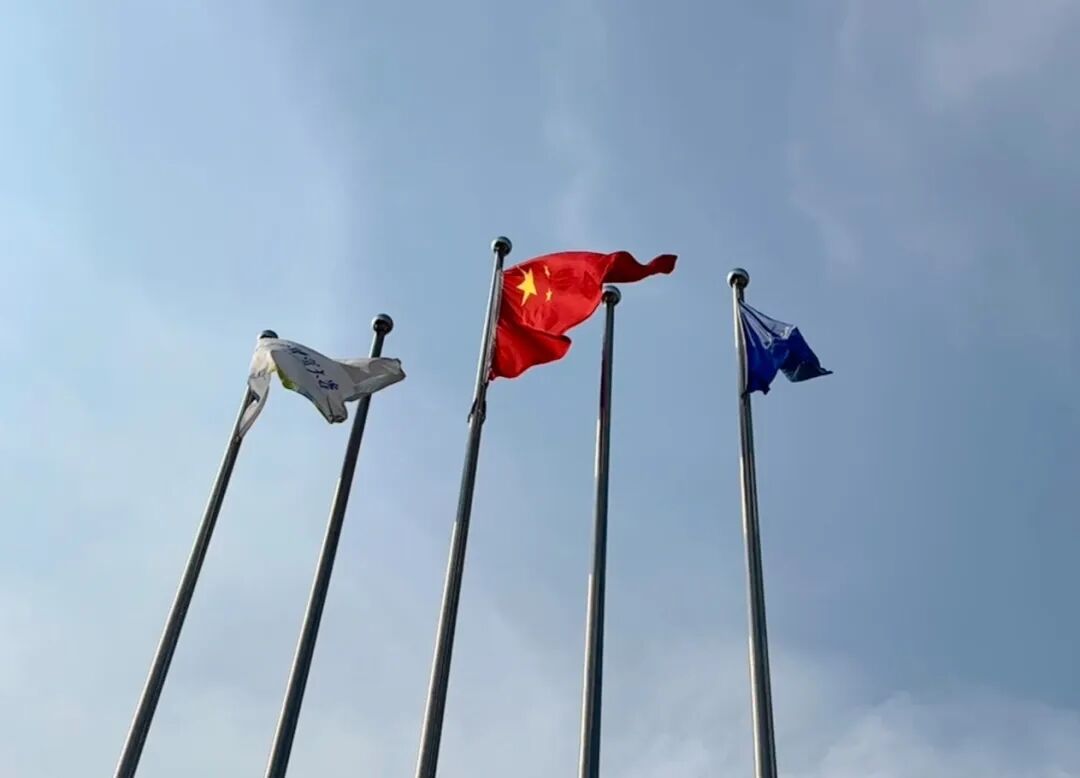儀式上,上海對(duì)外經(jīng)貿(mào)大學(xué)國(guó)旗護(hù)衛(wèi)隊(duì)的隊(duì)員們邁著鏗鏘有力的步伐護(hù)送五星紅旗邁向升旗臺(tái)。伴隨著《義勇軍進(jìn)行曲》響起,全場(chǎng)人員行注目禮,五星紅旗在朝陽(yáng)中冉冉升起,迎風(fēng)飄揚(yáng)。
