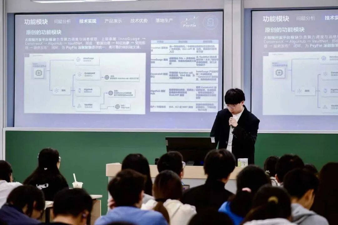 匡思煬團隊的作品聚焦大數據應用,他以團隊作品《PsyFin深融智策》為切入點,向大家展示了如何運用人工智能與大數據工程,實現對全球金融投資風口的全景洞察,最終達成大數據金融分析的智能化與標準化。作品中運用了量化DSL、多模態特征拼裝等諸多創新技術,充分體現了團隊強大的創新能力。最后播放了團隊制作的視頻,詳細解讀作品核心,讓同學們受益匪淺。