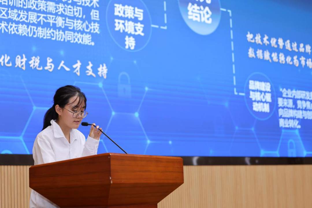 會上還進(jìn)行了調(diào)研隊伍成果展示。統(tǒng)計與數(shù)據(jù)科學(xué)學(xué)院本科生王晨、研究生江宇豪、國際經(jīng)貿(mào)學(xué)院本科生周禹璇分別以《新質(zhì)生產(chǎn)力視角下低空經(jīng)濟(jì)高質(zhì)量發(fā)展路徑研究—基于長三角地區(qū)的實證調(diào)研》《科技創(chuàng)新型企業(yè)新質(zhì)生產(chǎn)力影響因素與路徑機(jī)制研究》《科技創(chuàng)新驅(qū)動新質(zhì)生產(chǎn)力:長三角企業(yè)空間異質(zhì)性、障礙識別與品牌-數(shù)字化賦能路徑》為主題,就調(diào)研過程、分析工具、研究結(jié)論、政策等進(jìn)行了成果匯報。