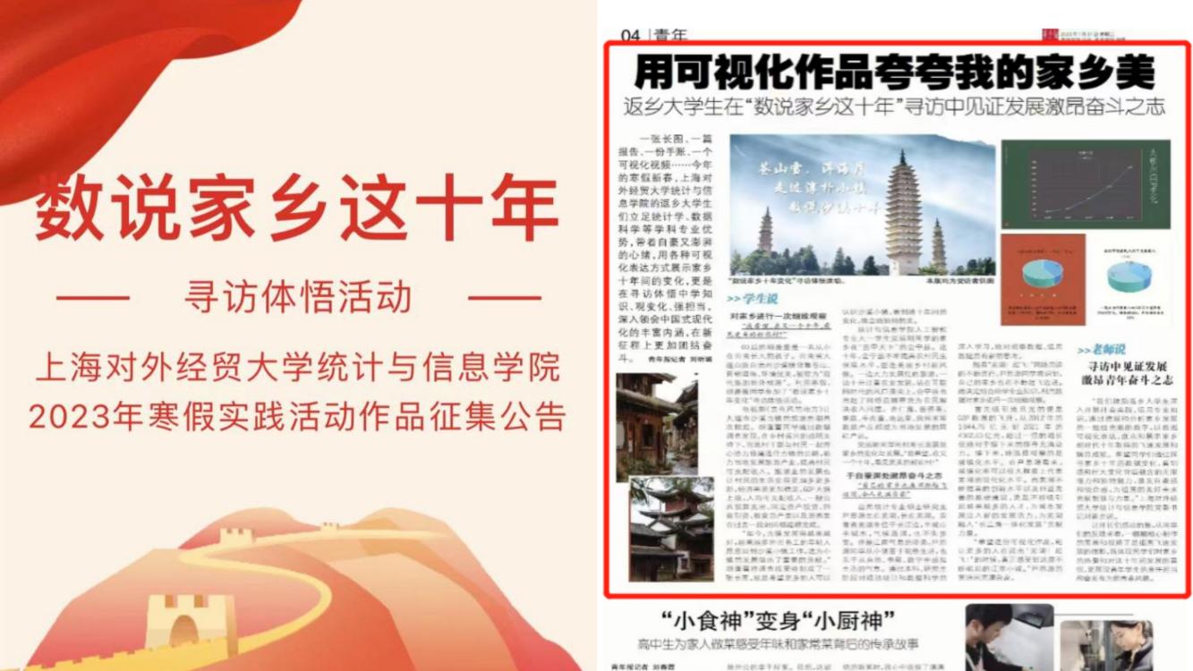 學校堅持不懈用習近平新時代中國特色社會主義思想鑄魂育人,把思想政治教育、理論學習融入“課程+科研+賽事+實踐”,形成了“學-教-研-行”四維體系,打造融理論性、學科性、趣味性與實踐性為一體的特色育人模式。開展了“數說黨史 數說中國”專題黨課、“數據里的黨團知識”競賽、“黨史數據可視化”設計大賽、“訪萬企,讀中國”大型社會調查等豐富多彩的校園文化項目。尤其是在2023年寒假期間面向返鄉學子開展“數說家鄉這十年”實踐活動,引導全校學生聚焦“數說城市發展”“數說鄉村振興”“數說幸福生活”為主題,以數據可視化方式,展現家鄉新時代十年取得的飛速發展和矚目成就?;顒邮艿饺8鲗W院返鄉大學生的積極參與,他們以100余份高質量的數據圖表和視頻盤點展示家鄉十年來取得的飛速發展和矚目成就,既有云南省沙溪古鎮的變化,也有長三角地區蕪湖的“起飛”,還有上海十年來的“綠色變身”,既體現同學們對家鄉的熱愛和對這十年間發展的喜悅,更激發了青年學生的責任擔當,展示了自信自強的精神風貌。