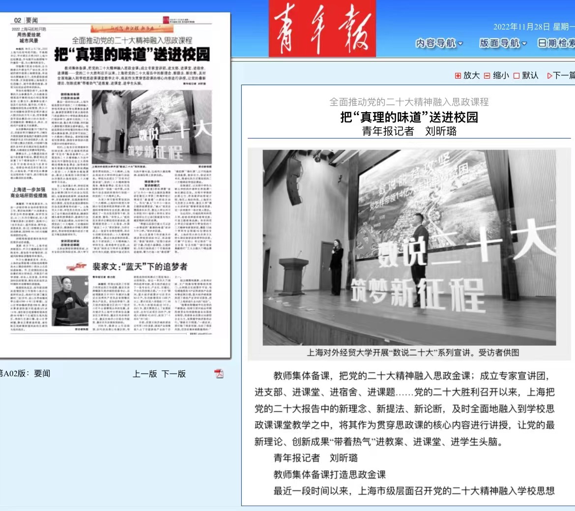 上海對外經貿大學“數說黨史 數說中國”系列活動具有鮮明的學科特色和時代特征,師生運用數據挖掘和數據分析方式,講黨史、讀中國、學思想、強擔當。“數說二十大”系列宣講開設《數說中國共產黨發展歷程》《數說新時代中國青年》《數說脫貧攻堅》《數字里的鄉村振興》等10個系列課程,把黨的二十大精神全面融入學科專業、教育教學全過程?!皵嫡f新時代十年發展成就”由師生在學校數字經貿實驗室里共上《數說貿易強國建設》《數說創新驅動發展》等思政課程,以大量的數據、圖表和分析對比,把新時代十年偉大變革和發展成就融入思政教育,讓課程更有說服力,讓師生更有“共鳴”、能“共情”。師生宣講團在上海市教衛工作黨委第三季“偉大工程”示范黨課上為全校師生授課“數說三件大事”,把習近平總書記在黨二十大報告中總結的“新時代十年來中國共產黨經歷的三件大事”數據化、可視化,讓二十大精神更抵達人心。青年報要聞版以《把“真理的味道”送進校園》為題,專題報道學院“數說”系列宣講活動。