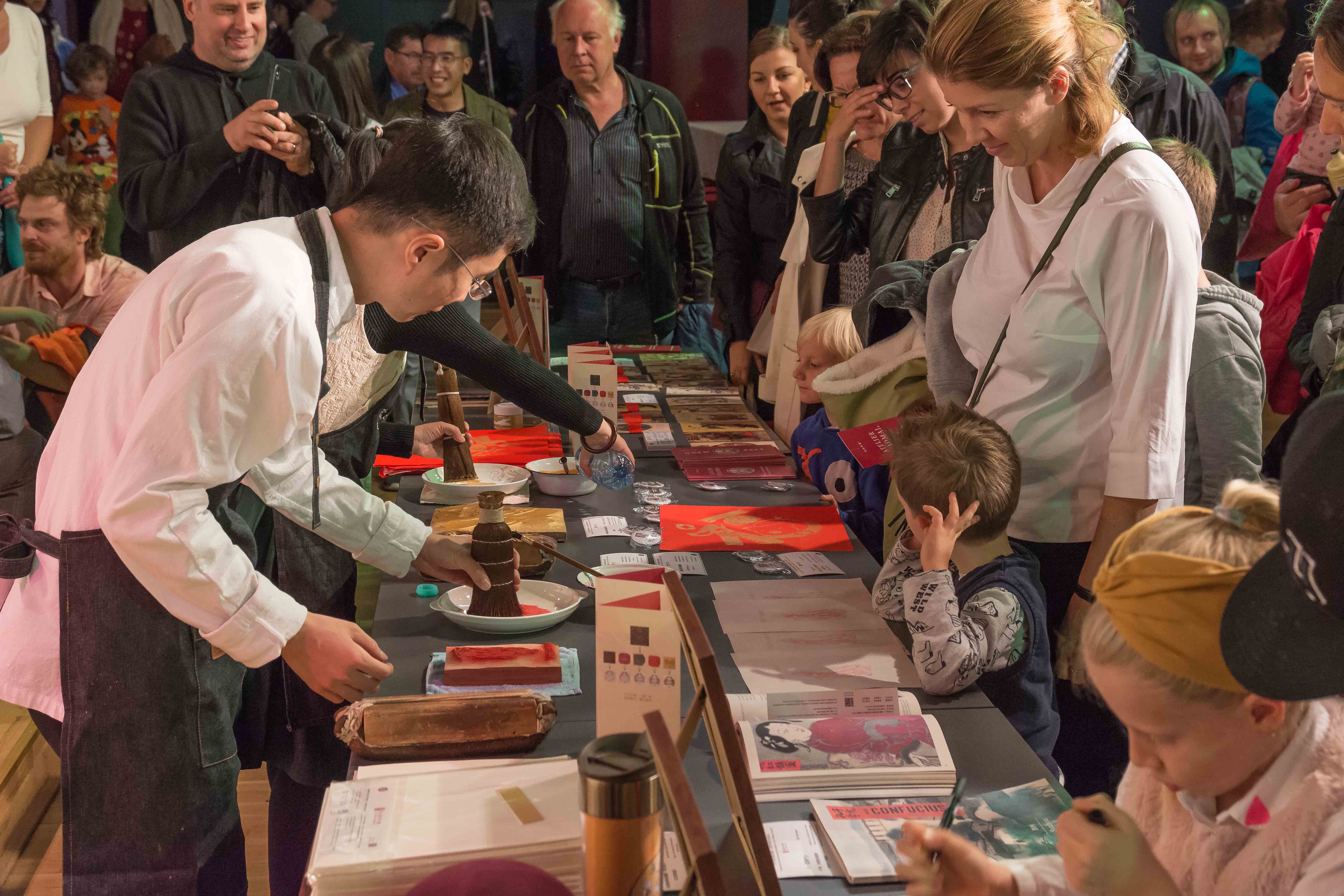 配合中國武術之夜演出,考門斯基大學孔子學院在演出大廳外舉辦了孔子學院日中國書法展和中國非物質文化遺產蘇州桃花塢木刻年畫展。上海交通大學文創學院教授、博士生導師、中國書法文化國際傳播研究所所長周斌先生和國家級非物質文化遺產蘇州桃花塢木刻年畫傳承人喬蘭蓉(喬麥)女士向斯洛伐克民眾展示了從中國帶來的數十幅精品創作。現場觀眾紛紛參與交流互動,林琳大使也親自體驗了木刻版畫孔子像的制作。