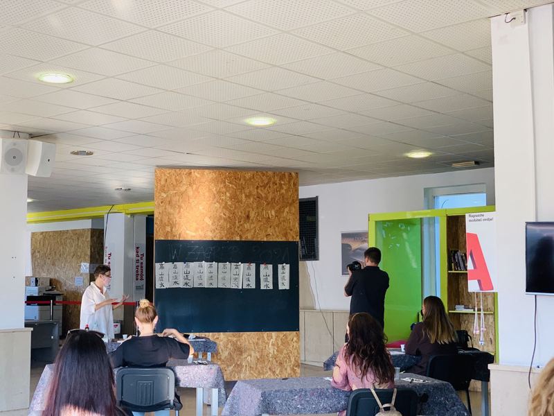 在書法體驗中,曾在中央美院學習的Iva Valenti?老師前來教授,學生們在這次活動中知曉了中國書法的隸書字體。老師首先介紹了楷書和隸書在寫法上的區(qū)別;隨后講解了書寫的基本步驟和這次要學寫的漢字;最后學生們在老師的指導下,寫出了一幅幅滿意的作品,感受到了用墨之美,漢字之秀。