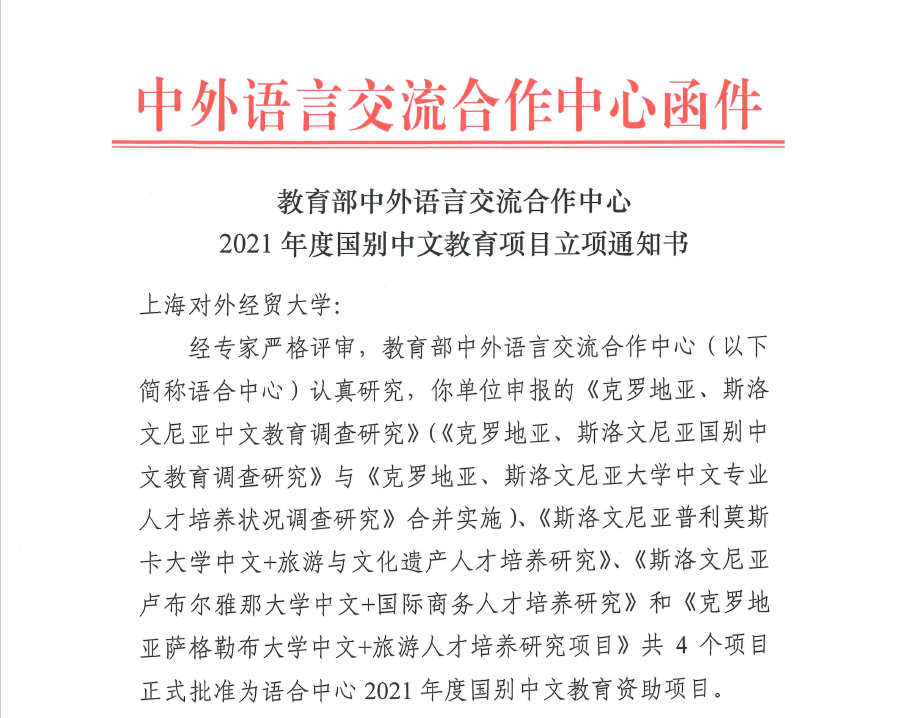 近日,學校申報的《克羅地亞、斯洛文尼亞中文教育調查研究》《斯洛文尼亞普利莫斯卡大學中文+旅游與文化遺產人才培養研究》《斯洛文尼亞盧布爾雅那大學中文+國際商務人才培養研究》和《克羅地亞薩格勒布大學中文+旅游人才培養研究》等4個項目正式獲批為教育部中外語言交流合作中心(簡稱語合中心)2021年度國別中文教育資助項目。
