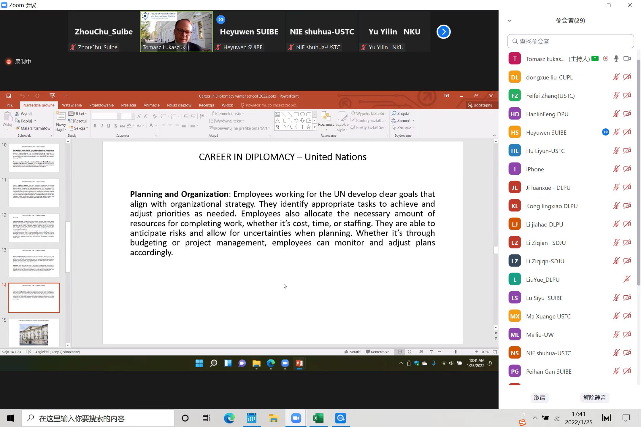 在課程設(shè)置上,波蘭華沙大學(xué)政治科學(xué)與研究學(xué)院根據(jù)自身所長和學(xué)生所需,開設(shè)了有關(guān)歐盟歷史與架構(gòu)、金融、國際關(guān)系方面的課程。課程分別于2022年1月24-28日和2月7-11日對我校參加項(xiàng)目的同學(xué)開設(shè),第一階段開設(shè)了華沙大學(xué)歷史名人與文化古鎮(zhèn)介紹、中歐經(jīng)濟(jì)關(guān)系、國際外交關(guān)系等課程;第二階段開設(shè)了國際金融市場、歐盟的歷史與架構(gòu)等課程。