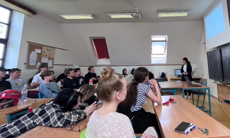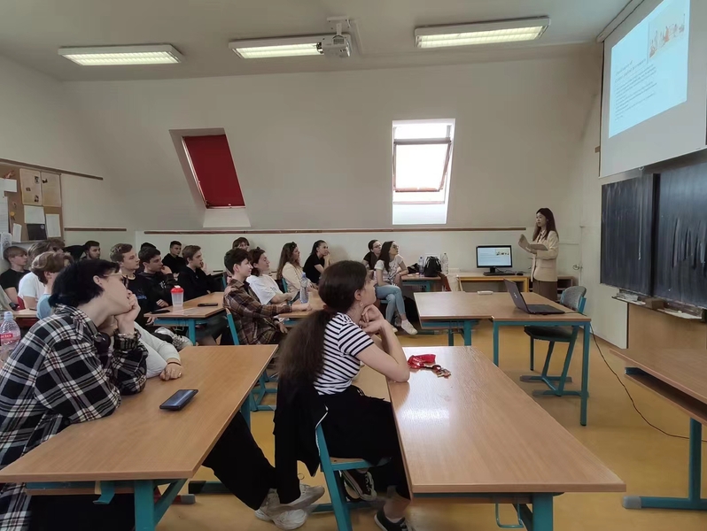 捷克時間2022年5月13日星期五下午,布杰約維采商業技術學院孔子課堂三位中文教師來到位于市郊的?esko-anglické gymnázium高中(以下簡稱為?AG高中),對該校學生進行2022-2023學年度秋季學期中文課程的宣講。