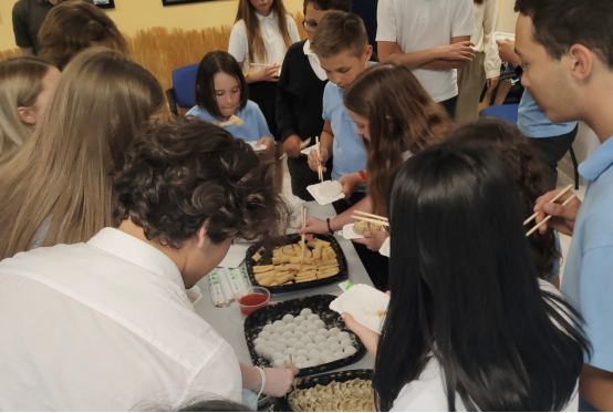 三位教師宣講結束后,隨著煎餃、春卷、湯圓和蝦片等中華特色美食陸續擺出,中華文化體驗活動正式開始。學生們一邊品嘗美食,一邊暢所欲言分享感受。有的同學向布杰孔堂的教師們興奮地談起了自己的中國旅行體驗和自己與中國有關的故事。現場氣氛歡快熱烈。品嘗完教師們精心準備的中華美食后,學生們在布杰孔堂教師們的指導下開始了自己的手工文化體驗。書法、剪紙、中國結……每位學生都根據自己的興趣選擇了體驗項目,教師們耐心細致地指導,學生們專注認真地觀摩學習。原定兩個多小時的體驗活動結束后,學生們依然沉浸其中不愿離去,紛紛表達了下學期參加中文課程的強烈愿望。