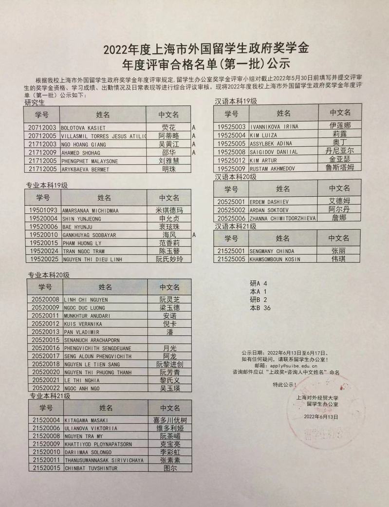 2022年度上海市外國留學生政府獎學金年度評審合格名單(第一批)公示