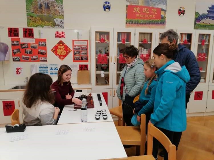 克拉尼孔堂的教室原本就有孔子畫像、中國地圖、中國新年主題的剪紙、春聯(lián)等裝飾,中國元素滿滿。為了更好地呈現(xiàn)中國文化,師生們還準(zhǔn)備了書法、茶藝、剪紙、中文數(shù)字游戲環(huán)節(jié)。