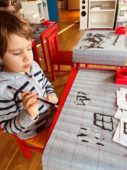 在書法體驗(yàn)課中,石超凡向Panda班學(xué)生介紹了“文房四寶”,并向?qū)W生展示了書法工具的擺放及握筆姿勢(shì)。學(xué)生樂在其中。在第一次課上,石超凡還提前準(zhǔn)備了“日”、“月”、“田”、“水”等象形字的甲骨文及卡通圖片,引導(dǎo)學(xué)生根據(jù)甲骨文猜測(cè)漢字的含義,然后借助卡通圖片向?qū)W生解釋漢字的含義,并指導(dǎo)學(xué)生臨摹書寫。學(xué)生在課程中既親身體驗(yàn)了中國文化,同時(shí)也領(lǐng)略了漢字的發(fā)展始源。