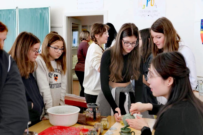 在茶藝桌上,克拉尼孔堂的學(xué)生Lana和Anglina展示了茶藝,并請(qǐng)參觀者們品茶。