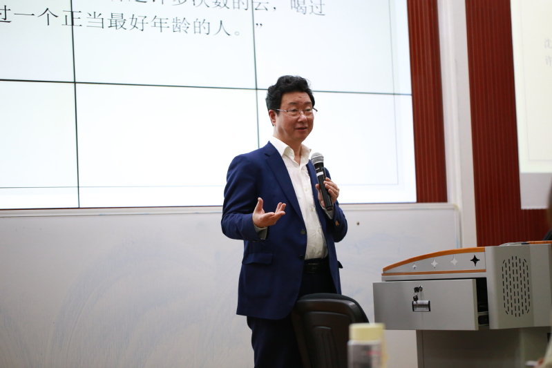 在專家導(dǎo)讀環(huán)節(jié),查明建教授為學(xué)生推薦的書目是《傷逝》和《理智與情感》(Sense and Sensibility)。查教授以中外文學(xué)經(jīng)典為例,圍繞“為什么‘愛情’是文學(xué)中的永恒主題?”、“為什么中外最感人的愛情主題作品,大多是悲劇?”、“古今愛情、婚姻觀為什么會(huì)演變?”三個(gè)方面展開,向在場(chǎng)師生娓娓道來。查教授指出,因?yàn)槿诵约捌淙说拇嬖跔顟B(tài)不可能是完美的,可能存在著種種悲劇和磨難。但是正因?yàn)橛辛嗽?shī)人,有了詩(shī)情和詩(shī)意,人們能夠體驗(yàn)到人性的美麗和光輝,享受人之為人的內(nèi)在韻味和愉悅之情。與詩(shī)同在,與詩(shī)意同在,是人類的一種幸運(yùn)與幸福。