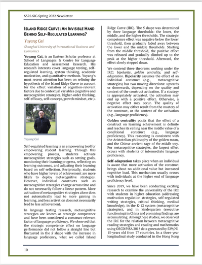 近日,我校蔡雨陽教授接到國際頂級教育學術組織美國教育學會(AERA)邀請,在其旗下的學術簡報SSRL SIG Newsletter撰文介紹其原創的“島脊曲線理論”,作為2022 年春季刊的焦點研究向全球自主學習研究領域重點推介。