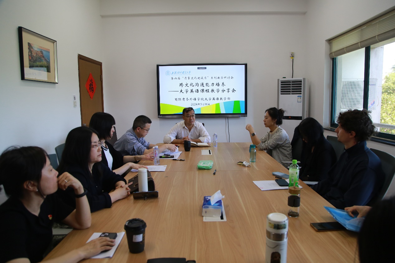 為進一步培養我校學生的跨文化溝通能力,探索相關教學方法和途徑,2024年5月14日下午,國際商務外語學院大學英語教學部和大學英語教研中心聯合在博雅樓324舉辦了“跨文化溝通能力培養—大學英語課程教學分享會”活動。本次活動也是第六屆“質量文化建設月”系列活動之一。國際商務外語學院副院長單建國、大學英語教研中心主任王春巖等參會。會議由單建國主持。
