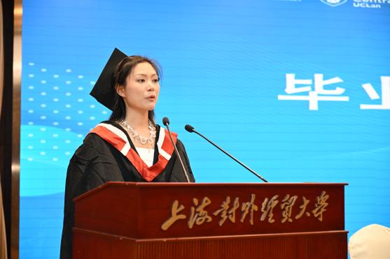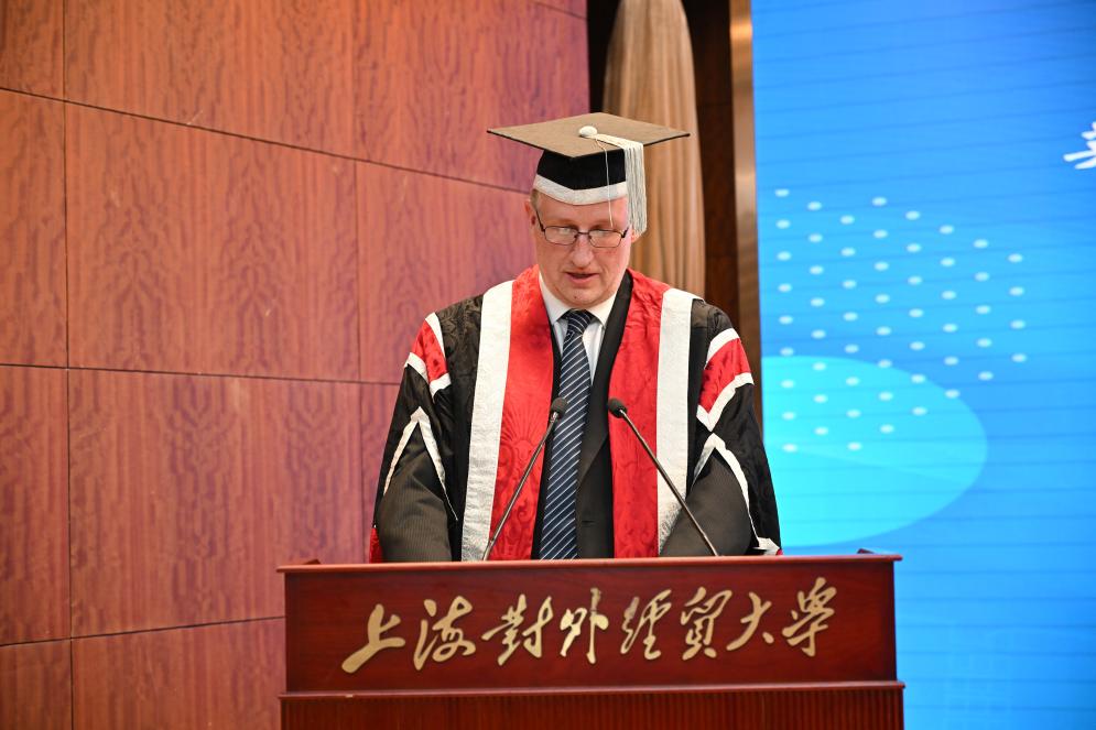 Bryan Jones致開幕辭。他表示很榮幸能夠在上海對外經貿大學見證這一歷史性時刻,慶祝畢業生們非凡成就的同時回顧兩校近四分之一世紀的持續合作伙伴關系。他指出,兩校合作期間有超過1500名學生畢業于中英合作項目。在中國新文科建設的背景下,兩校的合作伙伴關系繼續蓬勃發展。雙方共同致力于教職工培訓和課程改革,以確保合作教育項目始終處于學術卓越和創新的前沿。Paul Rowe致閉幕辭。他對為畢業典禮及兩校合作辦學做出卓越貢獻的兩校領導、項目教師和工作人員表示誠摯的謝意。中央蘭開夏大學期待不斷發展深化雙方合作伙伴關系。他表示,在畢業生們即將開啟人生新篇章的時刻,希望本次畢業典禮愉快且難忘。最后,他鼓勵畢業生積極加入中央蘭開夏校友會,并祝福全體畢業生成就美好未來。