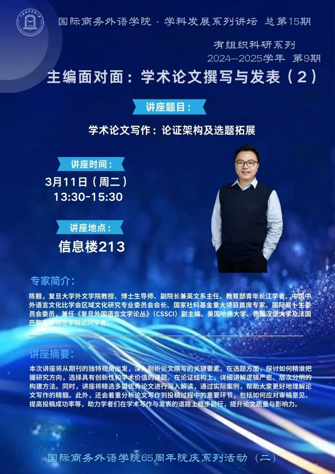 3月11日下午,復旦大學外文學院副院長、博士生導師陳靚教授應邀來到我院,為師生帶來題為“學術論文寫作:論證架構及選題拓展”的專題講座。