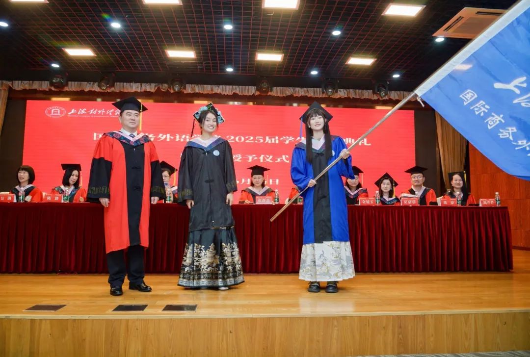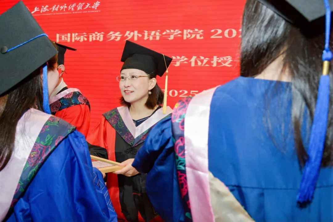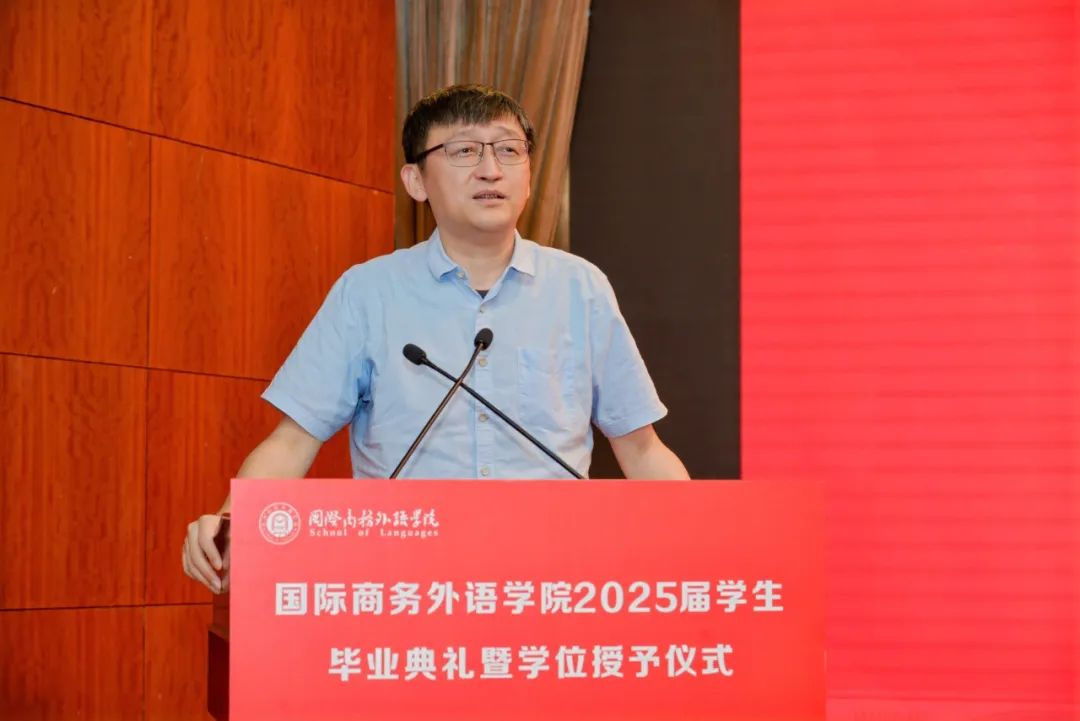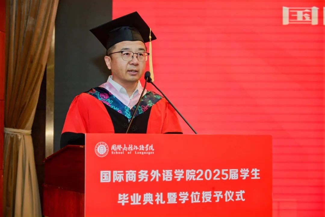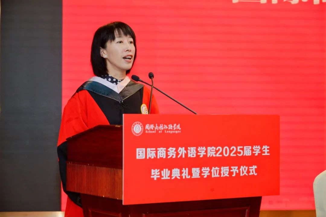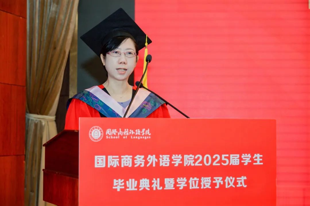 張蔚磊代表學院向圓滿完成學業的2025屆畢業生表示熱烈祝賀,并向關心培育學生成長的親友和師長致以誠摯敬意。她在講話中提到,當下新一輪科技革命與產業變革加速演進,中國正以更開放的姿態參與全球治理,站在新的歷史方位,強國建設與民族復興的宏偉藍圖亟待青年一代接續奮斗。她對同學們提出三點希望:一是希望同學們格物致知,在文明互鑒中找準價值錨點,在實踐的理性分析和價值判斷中,“格”跨文化之“物”,“致”全球勝任力之“知”。二是希望同學們融通創新,在智能時代淬煉核心優勢,通過DeepThink解讀文本背后的文化內涵;通過DeepSink把握文明演進的內在邏輯;通過DeepCreate在語言與科技的共生進化中,重新定義外語人的時代坐標。三是希望同學們胸懷家國,在時代征程中開拓人生疆界,自覺將個人追求與民族復興同頻共振,在服務國家高水平對外開放和上海城市高質量發展的實踐中貢獻青春智慧、實現人生價值。