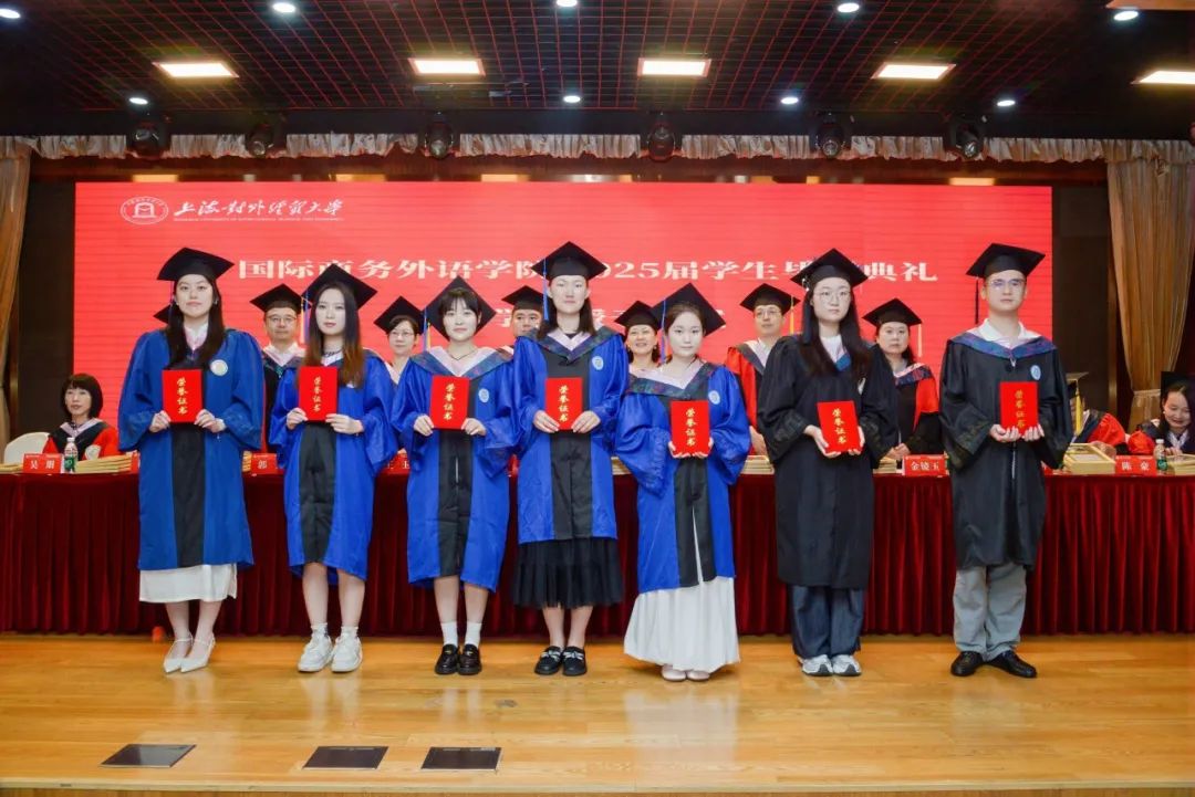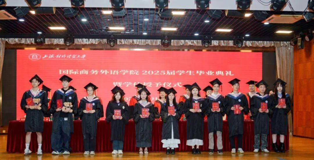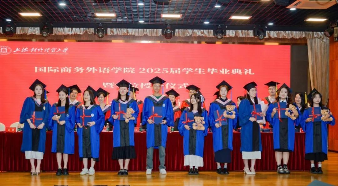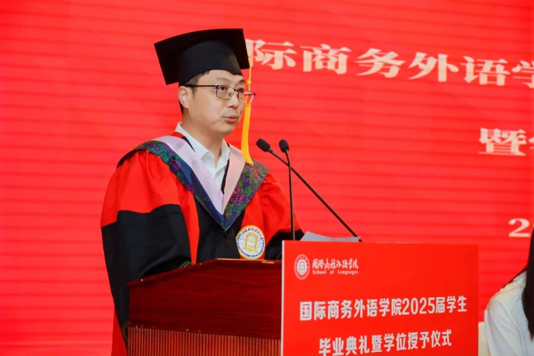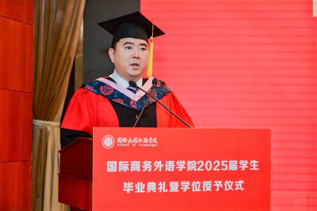 6月26日上午,國際商務外語學院2025屆學生畢業典禮暨學位授予儀式在圖文信息大樓507報告廳舉行。學院黨委書記劉根春、院長張蔚磊、副院長王玉、雷春林、郭義,學院學位評定分委員會委員、教師代表、校友代表、畢業班輔導員、2025屆本碩畢業生及家長代表共同參加畢業典禮。典禮由學院黨委副書記程祎瞳主持。