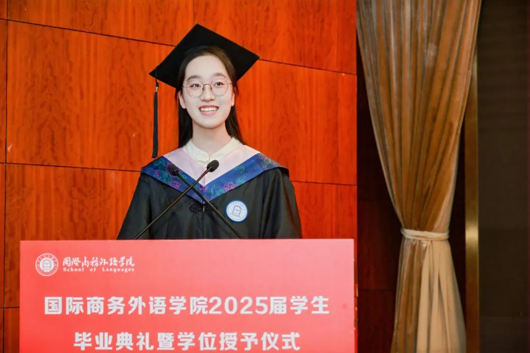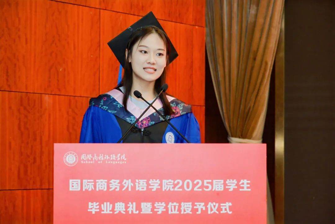 畢業生李喬喬作為2025屆研究生代表發言。她回顧了與英語結緣、圓夢上經貿大的學習旅程,感謝母校提供的廣闊實踐平臺,助力她完成了“紙上談兵”到“實戰練兵”、從“被動接受”到“主動創造”的蛻變。她表示會始終牢記校訓精神,以專業素養服務社會,用實際行動詮釋貿大學子的責任與擔當。