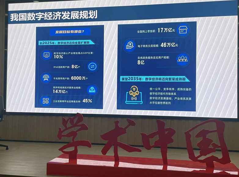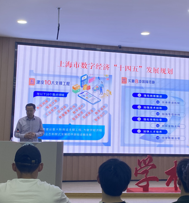 邵志清教授重點講述了數字經濟的內涵和數字經濟四大構成要素,即數字產業化、產業數字化、數字化治理、數據價值化,并結合我國數字經濟發展現狀,幫助師生們解讀了我國數字經濟發展規劃和上海市數字經濟“十四五”發展規劃。鼓勵廣大青年學子積極融入國家數字經濟發展趨勢,挖掘自身潛力,努力將自己培養成為數字化領域的高技能青年人才,為國家發展做出貢獻。