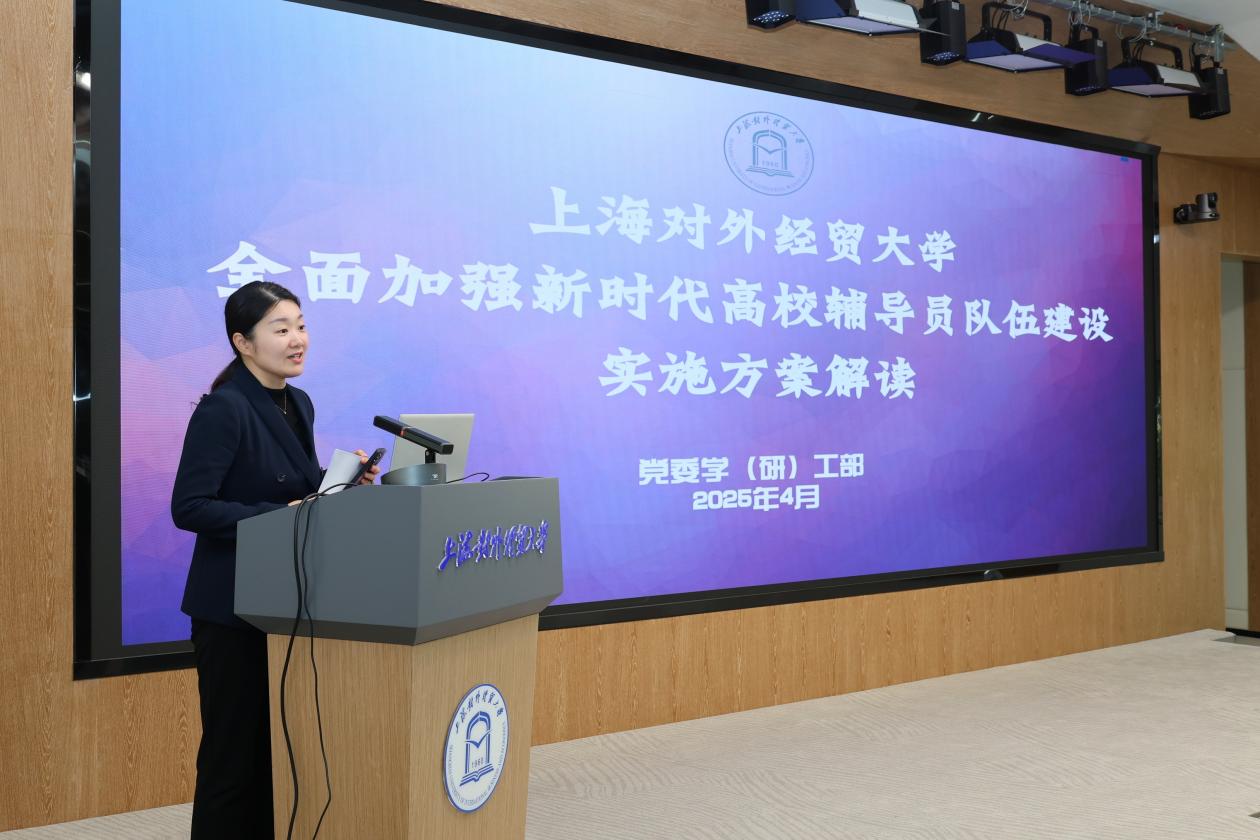 黨委學(研)工部部長繆韻笛全面解讀了學校黨委印發(fā)的《上海對外經貿大學全面加強新時代高校輔導員隊伍建設實施方案》。方案以回答好建設教育強國核心課題為立足點,充分認識高校輔導員隊伍建設的極端重要性,按照“科學化管理、專業(yè)化培養(yǎng)、精準化育人、國際化視野”建設理念,以配備選聘為基礎、培養(yǎng)培訓為引擎、暢通發(fā)展為關鍵、成長賦能為支撐、考核評價為激勵,全面推進學校輔導員隊伍專業(yè)化職業(yè)化專家化發(fā)展,打造一支政治堅定、數量充足、結構合理、素質過硬、發(fā)展有力的輔導員隊伍,為培養(yǎng)擔當民族復興大任的時代新人,推進學校實現(xiàn)高質量發(fā)展,加快建設特色鮮明、世界一流大學貢獻力量。