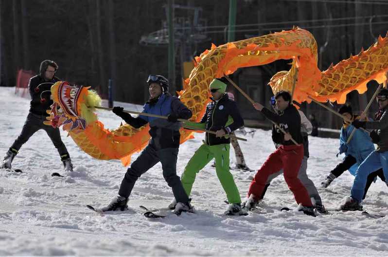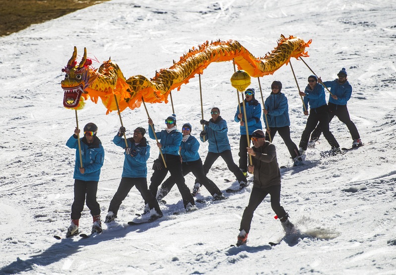 下午三時許,一條由十余名滑雪者舞動的“中國龍”,從山頂雪場馳雪而下。通過懸浮空中的無人機追隨俯瞰,這條金龍引角戲珠,六丈龍身翻躍翔動,首尾搖擺蜿蜒而行,在數百米的雪道上,騰云翻滾駕霧穿梭,留下一條條優美的曲線。