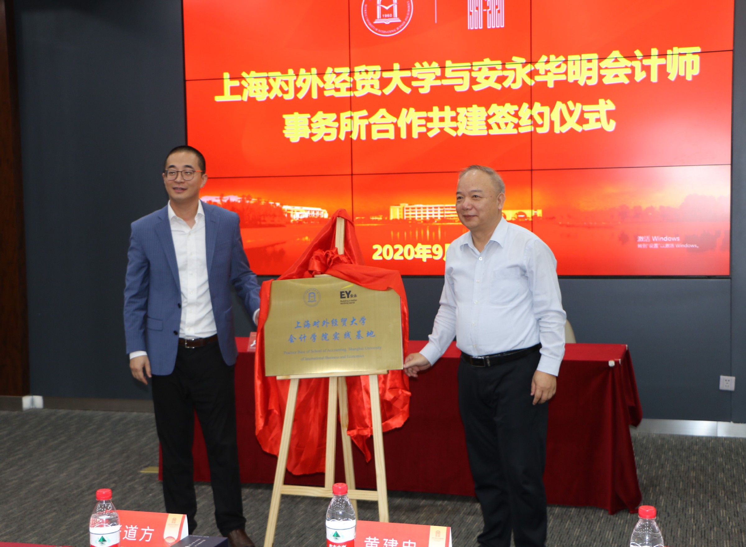 談華與李新玥分別代表校企雙方簽署了“共建長期實踐基地”協(xié)議書。研究生院院長黃建忠與董彥亮共同為“上海對外經(jīng)貿(mào)大學(xué)會計學(xué)院實踐基地”揭牌。