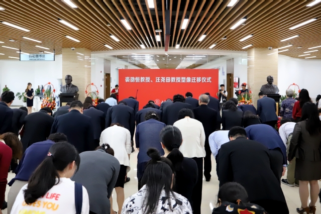 10月9日下午,學校在圖書館新館大廳隆重舉行圖書館新館開館儀式暨裘劭恒教授、汪堯田教授塑像遷移儀式。上海市政協副主席、我校杰出校友周漢民,校黨委書記殷耀、校長汪榮明、老校長孫海鳴共同為圖書館新館揭牌。塑像遷移儀式上,裘劭恒教授和汪堯田教授家屬代表、我校師生代表分別向兩位前輩塑像獻花,全體嘉賓向塑像三鞠躬,以表對裘劭恒教授和汪堯田教授的崇高敬意和深切緬懷。