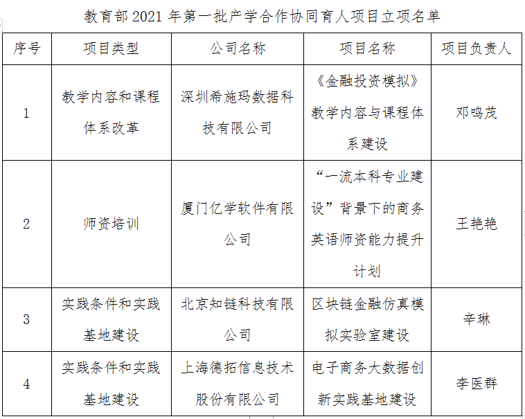 近日,教育部發(fā)布了《教育部高等教育司關(guān)于公布2021年第一批產(chǎn)學(xué)合作協(xié)同育人項(xiàng)目立項(xiàng)名單的通知》(教高司函〔2021〕14號(hào)),我校《<金融投資模擬>教學(xué)內(nèi)容與課程體系建設(shè)》《“一流本科專業(yè)建設(shè)”背景下的商務(wù)英語師資能力提升計(jì)劃》《區(qū)塊鏈金融仿真模擬實(shí)驗(yàn)室建設(shè)》《電子商務(wù)大數(shù)據(jù)創(chuàng)新實(shí)踐基地建設(shè)》等4個(gè)項(xiàng)目獲得立項(xiàng)。