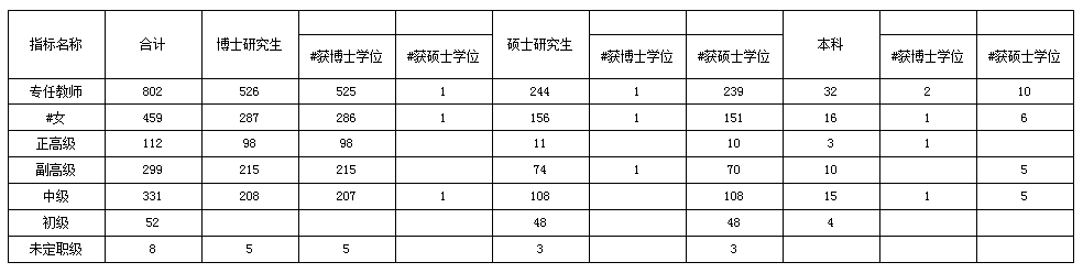 截至2021年9月,學校在崗專任教師共802人。專任教師中正高級教師112人,副高級教師299人。專任教師中“博士學位教師”528人,占比65.83%。專任教師中“海外研修1年以上”教師282人,占比35.16%。學校另有各類外聘教師200余人。