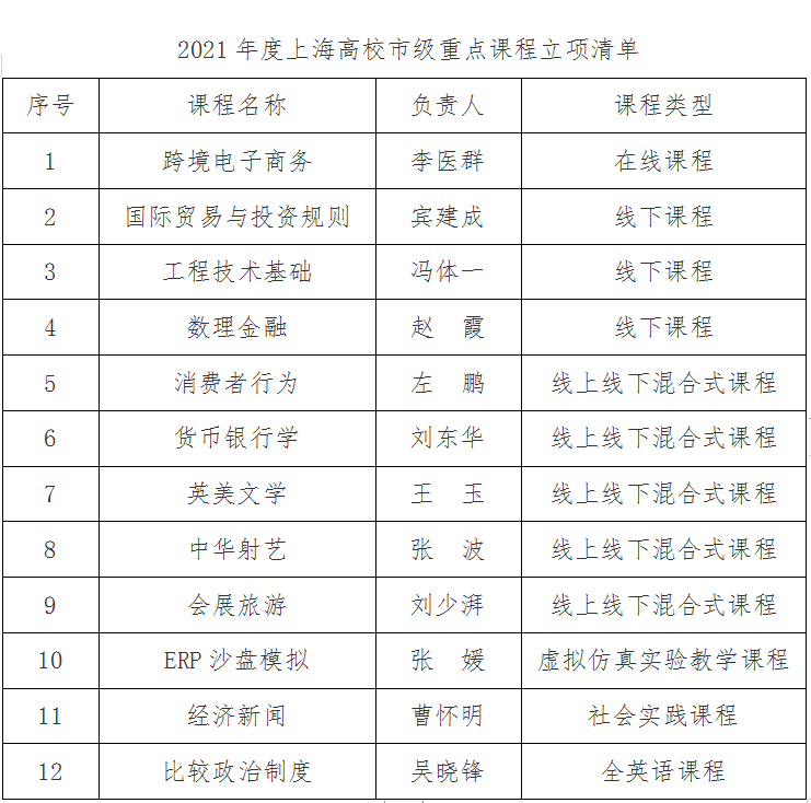 近日,上海市教委發(fā)布了《上海市教育委員會(huì)關(guān)于公布2021年度上海高校市級(jí)重點(diǎn)課程立項(xiàng)名單的通知》(滬教委高〔2021〕34號(hào)),我校申報(bào)的《跨境電子商務(wù)》等12門課程全部獲得立項(xiàng)建設(shè)。其中,在線課程1門,線下課程3門,線上線下混合式課程5門,虛擬仿真實(shí)驗(yàn)教學(xué)課程1門,社會(huì)實(shí)踐課程1門,全英語課程1門。