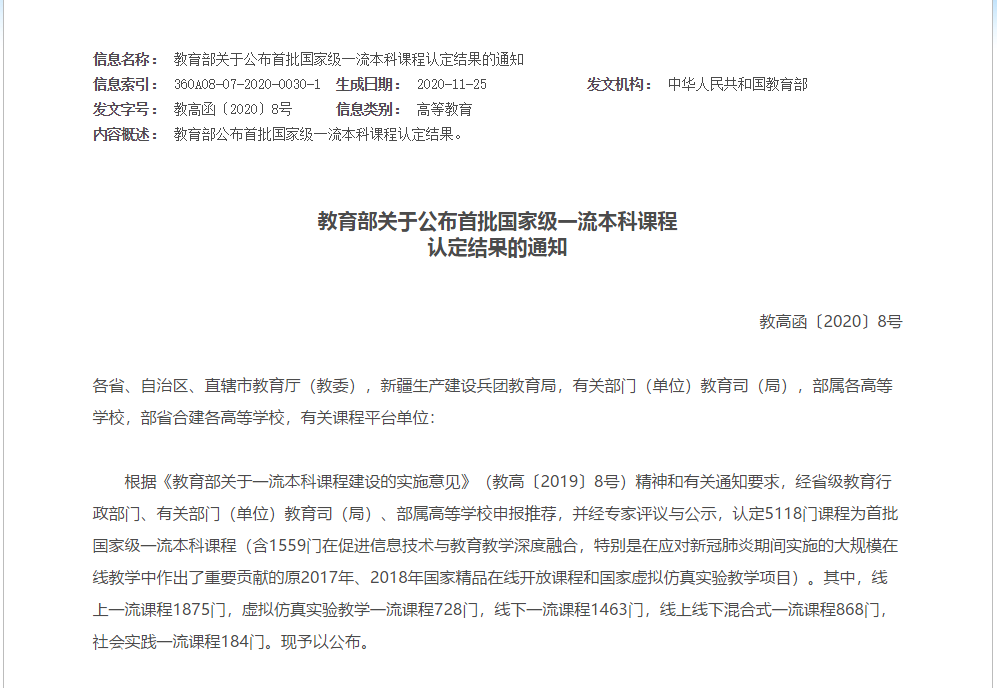 此次教育部首批認定了5118門國家級一流本科課程,其中線上一流課程1875門,虛擬仿真實驗教學一流課程728門,線下一流課程1463門,線上線下混合式一流課程868門,社會實踐一流課程184門。教育部2019年出臺《教育部關于一流本科課程建設的實施意見》(教高〔20198號),啟動一流本科課程“雙萬計劃”,經過三年左右時間,建成萬門左右國家級和萬門左右省級一流本科課程,推進本科課程“質量革命”。