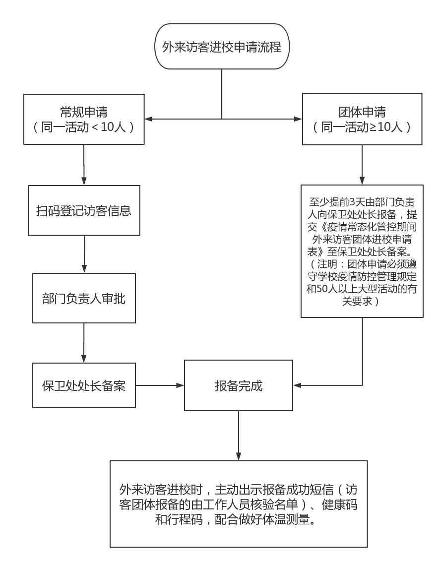 如外來訪客團體申請進校(同一活動≥10人申請進校),須嚴格遵守學校疫情防控管理規(guī)定和50人以上大型活動管理要求,至少提前3天由部門負責人向保衛(wèi)處報備,并提交附件二:《疫情常態(tài)化管控期間外來訪客團體進校申請表》。