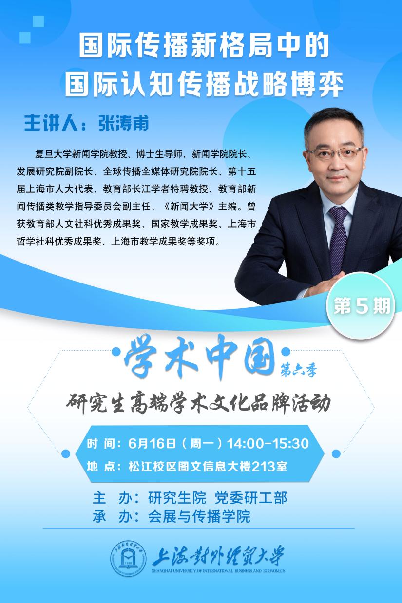 6月16日下午,由研究生院、黨委研工部主辦,會展與傳播學(xué)院承辦的研究生高端學(xué)術(shù)文化品牌活動“學(xué)術(shù)中國”第六季第5期講座在松江校區(qū)圖文信息大樓213會議室如期開講,復(fù)旦大學(xué)新聞學(xué)院張濤甫教授作題為《國際傳播新格局中的國際認(rèn)知傳播戰(zhàn)略博弈》的專題講座。講座由會展與傳播學(xué)院院長王春雷教授主持。